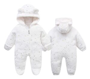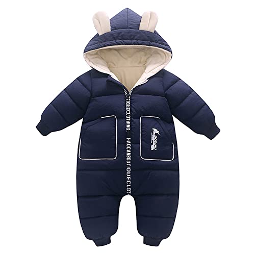 WonKinのロンパースは厚手で防寒性に優れ、冬の雪遊びに最適です。フード付きで、男の子・女の子両方に対応。サイズは80、90、100あり、出産祝いにもぴったり。色はネイビーブルー。