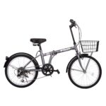折りたたみ自転車・20インチ・シマノ6段変速仕様で、通勤や通学に最適。カゴ付きで前後泥除けも完備。小径車のグレー色。コンパクトに折りたため、収納や持ち運びに便利です。
