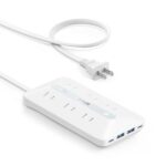AnkerのUSB電源タップは10個のポート(6口AC、USB-C、USB-A)を備え、20Wの出力が可能。1.5mの延長コード付きで、MacBookや各種スマートフォン、ノートPCと互換性あり。PSE適合、USB Power Delivery対応。