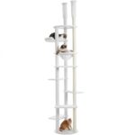 キャットタワーはスリムな省スペース設計で、高さ225-240cmまたは250-265cmの突っ張りタイプ。大型猫や多頭飼いに最適で、6本の天然サイザル麻紐を使った爪とぎ機能付き。見晴台や透明宇宙船デザインが魅力。