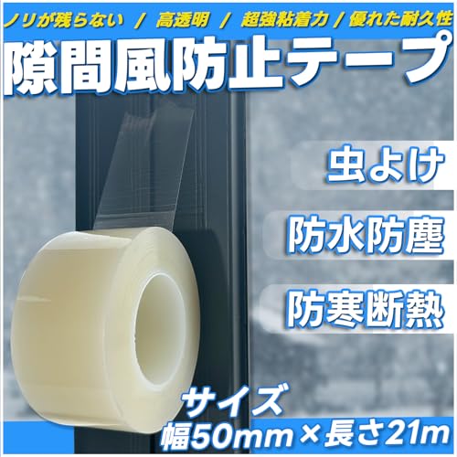 隙間テープは、幅50MM×21Mのクリアタイプで、窓やドアの隙間風を防ぎます。ノリ残りせず断熱、防水、防塵等に優れ、冷暖房効率をアップ。夏涼しく冬暖かく、結露抑制にも効果的です。