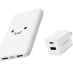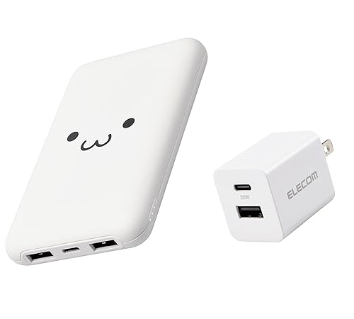 エレコムの充電器セットには、10000mAhの大容量モバイルバッテリー(USB PD 20W対応)と2ポート充電器(折りたたみ式プラグ)があります。白色で、同時充電が可能です。