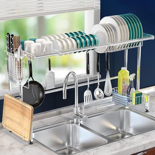 水切りラックはシンク上に取り付け可能で、50~90cmに伸縮します。ステンレス製で耐久性があり、食器の水切りや収納に便利。まな板スタンドや箸/包丁置きも付属しており、キッチンを整理整頓できます。