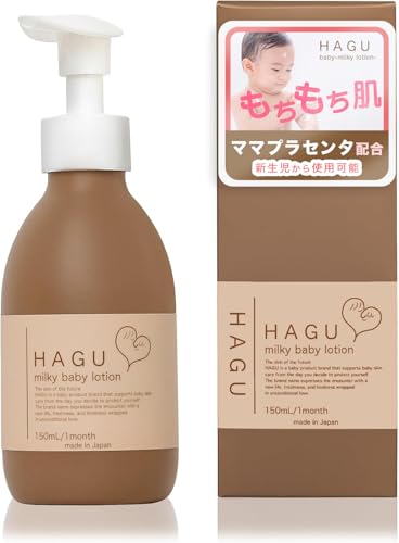 HAGU ハグベビー ベビーローションは、低刺激で新生児にも安心のクリームです。無添加・無香料で、150mLの容量で赤ちゃんの保湿に最適です。