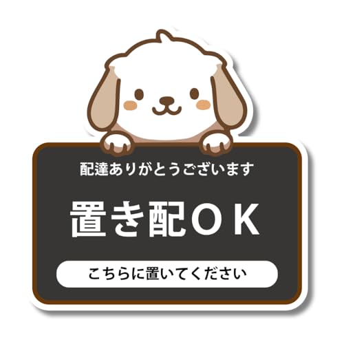 おしゃれな置き配OKステッカー(イヌ柄)です。再剥離可能なラミネート仕上げで、屋外でも安心して使用できます。”こちらに置いてください”のメッセージ入りで、配達員に優しくアピール。