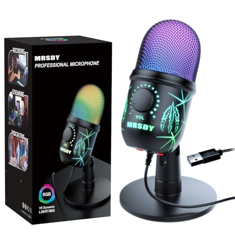 MRSDY ゲーム用マイク PC Mac PS4/5用 USB コンピューターマイク スタジオ録音 YouTube ストリーミング用のコンデンサー型ポッドキャストマイク ヘッドフォンジャック RGB ミュート ゲイン ノイズキャンセリング機能付き
