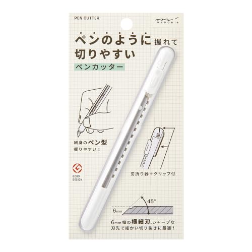 ミドリの白いペンカッター(型番35557006)は、スリムなデザインが特長で、精密なカッティングを実現します。軽量で持ちやすく、クラフトや文房具の用途に適しています。替え刃も簡単に交換可能です。