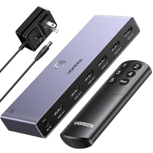 UGREEN HDMI切り替え器は5入力1出力で、8K@60Hz対応。HDCP 2.3/HDMI 2.1対応の手動切替機。Windows、MacOS、Linuxに対応し、PS3/PS4/PS5/Switchの動作確認済み。電源アダプター付属。