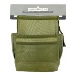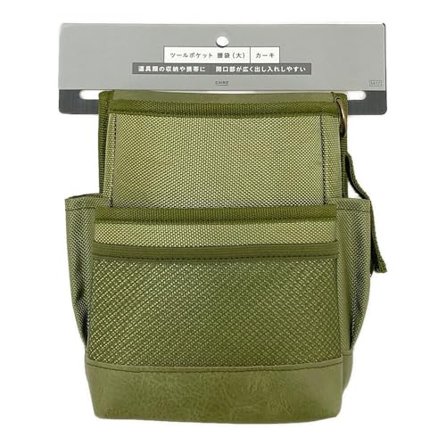 カインズのツールポケット腰袋は、カーキ色で幅17cm、奥行9cm、高さ21.5cmの大サイズです。Dカン付き、サイドポケットもあり、型崩れしにくい背板付きで便利なDIYツールです。