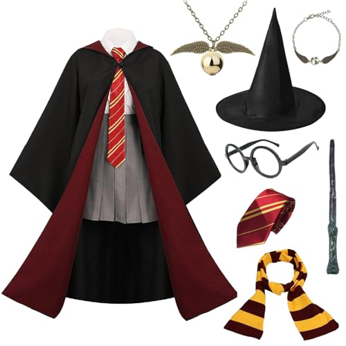 ハロウィンに最適なグリフィンドールコスチューム、豪華な8点セット。魔法の杖やネックレス、帽子など、9つのサイズご用意。男女兼用でパーティーやイベントにぴったり!