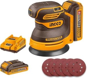 INGCO 20Vコードレスランダムオービットサンダー125mm、ブラシレスモーター、6段変速、 1個の2.0Ahバッテリーと1個の充電器付きCROSLI20021