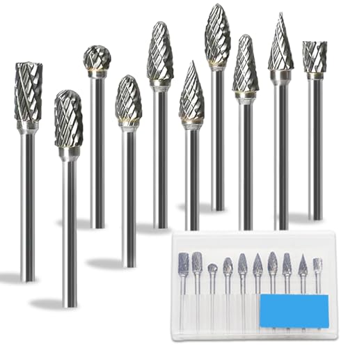 ロータリーツール用ダブルカットロータリーバリ10個セット。高品質なスチール製で、木工や金属の彫刻、研磨に最適。ボックス付きで収納も便利。