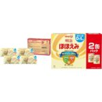 明治ほほえみらくらくミルクは、常温で飲める液体ミルクで120mlが24本セット。低月齢から使用可能。明治ほほえみ粉ミルクは800gの缶が2つ入り。0ヵ月から1歳頃まで対応。