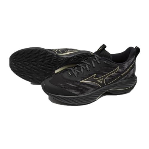 ミズノのウエーブライダー GTXは、軽量で反発性に優れた厚底のランニングシューズです。ゴアテックス採用で防水性も備え、ジョギングやマラソンに最適。カラーはブラック×ゴールド、サイズ24.5cm、幅は2Eです。