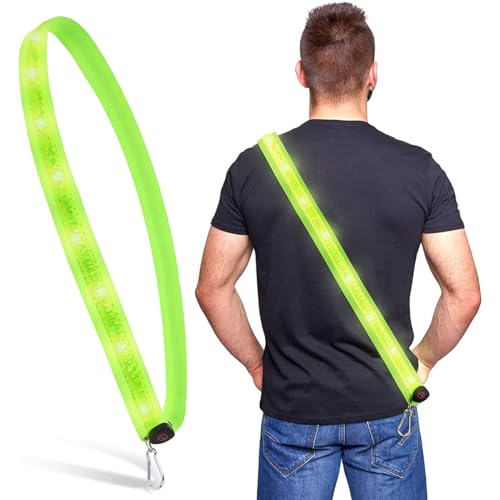 夜間のランニングやアウトドアに最適な充電式LED反射タスキ。明るい光で安全を確保し、事故防止に役立ちます。犬の散歩やジョギング時にも安心です。