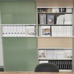 ロールスクリーン(グリーン、幅45cm、丈180cm)はマグネット取り付け可能で、オフィスやスチールラック、シェルフの目隠しに最適です。シンプルなデザインで取り扱いやすく、プライバシーを確保します。