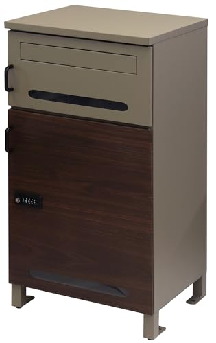 MOJYU 宅配ボックス付ポスト Saraは、ミルクティーベージュ/ブラウン木目の色合いが特徴のスタイリッシュなメールボックスです。鍵付きで自立型、北欧風デザインが玄関を引き立てます。