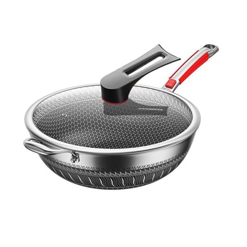 Sarinyのステンレス鋼製深型厚型フライパン。油煙が少なく、中華料理に最適。ガラス蓋付きで、多用途。すべてのストーブ対応、家庭用にもぴったり。サイズは36cm。