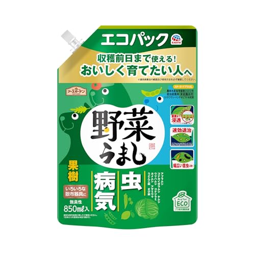 アースガーデンの野菜うましエコパックは、850mlの作物用殺虫殺菌剤です。家庭菜園やガーデニングに最適で、害虫駆除や病気予防に役立ちます。スプレー式で使いやすく、エコパウチ仕様です。
