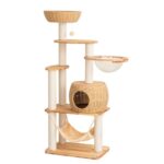 PETTIFULキャットタワーは、天然木を使用した省スペース型の大型猫用タワー。176cmの高さで安定感抜群、手編みのカゴやクリアボウル、爪研ぎポールを搭載。多頭飼い向けでインテリアにも最適。