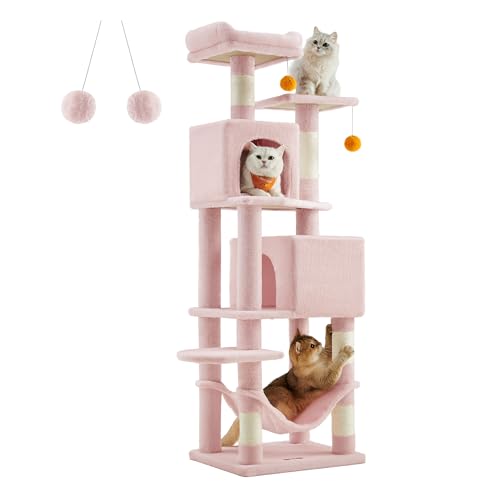 FEANDREAキャットタワー(スリム)は、高さ155CMで大型猫や多頭飼いに最適。省スペースデザイン、ハンモック付きで爪とぎ機能もあり、運動不足解消に役立ちます。ピンク色で可愛らしい外観。