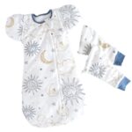 赤ちゃんおくるみは新生児用のスリーパーで、冬の夜泣き対策に最適。厚手の綿100%素材でモロー反射を軽減。ダブルジッパーでおむつ替えも簡単。2種類の袖デザインがあり、0-6ヶ月対応(星空太陽柄)。