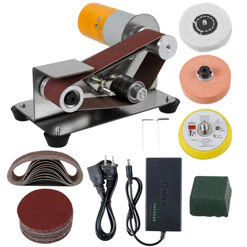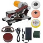 Shuilingの小型電動ベルトサンダー。110V-220V対応、木材・金属・アクリルに対応。卓上での使用にも便利で、簡単操作で家庭用に最適です。