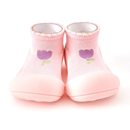 アティパスのファーストシューズ「Tulip」は、11.5㎝のピンク色で、軽量で柔らかく、赤ちゃんの足に優しい設計です。安心の止滑底で、初めての一歩をサポートします。