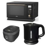 山善の新生活家電3点セットには、25Lのスチームオーブンレンジ(MRK-F250TSV)、5.5合炊飯器(YJP-DM102)、1.0L電気ケトル(DKE-100)のブラックカラーが含まれています。一人暮らしや二人暮らしに最適です。