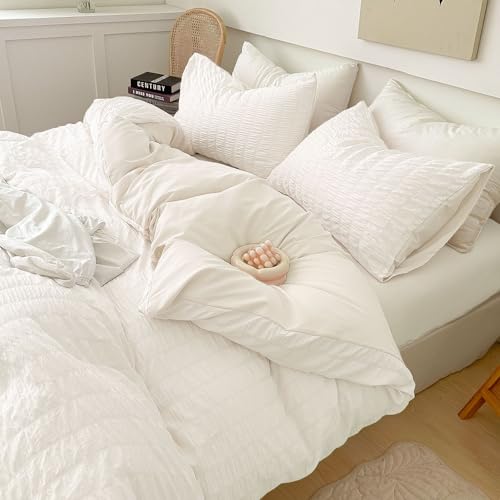 シアサッカー生地の布団カバーセットは、シングル・ダブル対応の3点セット。掛け布団カバー、ボックスシーツ、枕カバーが含まれ、可愛く柔らかい。通気性と速乾性に優れ、丸洗い可能。セミダブル4点セットもあり、ホワイトカラーで快適な眠りを提供。