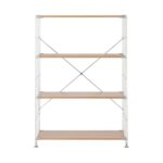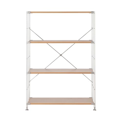 無印良品のステンレスユニットシェルフは、オーク材棚セットを含むワイドサイズです。サイズは幅86cm、奥行41cm、高さ120cmで、耐久性とデザイン性を兼ね備えています。