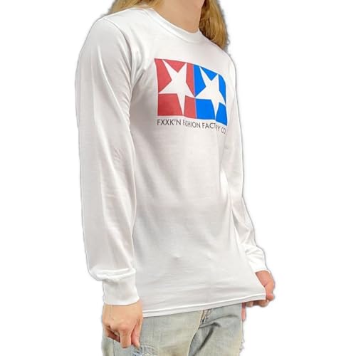 ネオヴィンテージロンTシャツは、逆五芒星デザインとデビルスターのモチーフを取り入れた長袖Tシャツです。ミニ四駆やプラモデルのファンにもおすすめのLサイズで、企業ロゴのパロディも特徴的で遊び心満載。