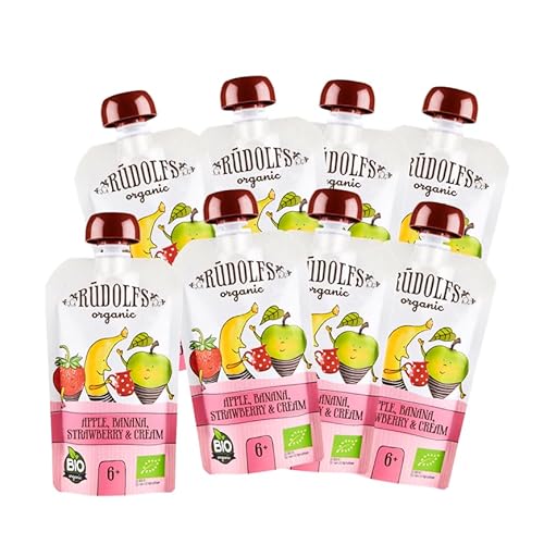 Rudolf(ルドルフ) 有機フルーツのベビースムージー110g 8個セットは、アップルとストロベリーを使用した健康的で美味しい赤ちゃん向けスムージーです。無添加・有機素材で安心して与えられます。