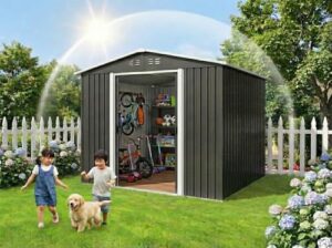 大型屋外収納庫 防水耐候性 頑丈スチール製 鍵付き物置 ガーデン収納 農作業用具保管 調整可能棚板 転倒防止設計 ブラック