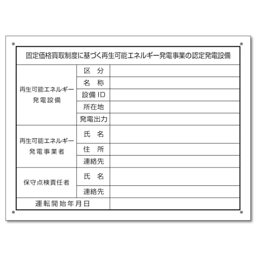 改正FIT法対応の太陽光発電設備看板(AP板4Sサイズ)は、耐候性が高く、視認性に優れたデザインです。設置場所に適したサイズで、法律遵守をサポートします。