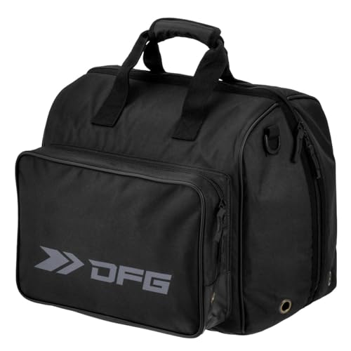 DFGヘルメットバッグは汎用ブラックで、大容量のサイドポケット付き。傷つき防止設計とショルダーストラップがあり、バイクやモトクロス、MTB、BMX、スノボ用のゴーグル収納にも適しています。