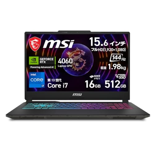 MSIのCyborg 15は、Core i7とRTX 4060を搭載したゲーミングノートPC。15.6インチFHDディスプレイ、144Hzリフレッシュレート、16GB RAM、512GBストレージ、Windows 11を搭載。薄型軽量デザイン。