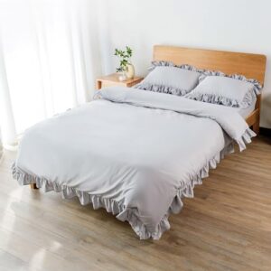 布団カバーセットはフリル付きで、洋式・和式兼用の3点または4点セット。肌に優しいピーチスキン加工、北欧風デザインで四季通用。掛け布団カバー、ボックスシーツ、枕カバーを含みます。
