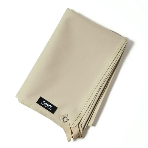 NEWTのグランドシートは耐水圧8000mmで試験合格。サイズは200cm×145cmの大型で、撥水・防水・断熱仕様。ポリオックスフォード生地を使用し、収納バッグ付き。風でめくれにくいデザインのベージュ色です。