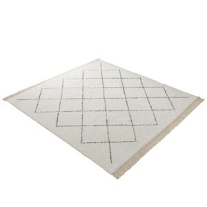 グラムスタイルのフロアタイルは、2畳分(90cm×90cm×4枚)で、厚み3mmの大理石調ラフコンクリートグレーです。置くだけで簡単に設置でき、接着剤は不要です。