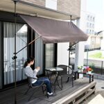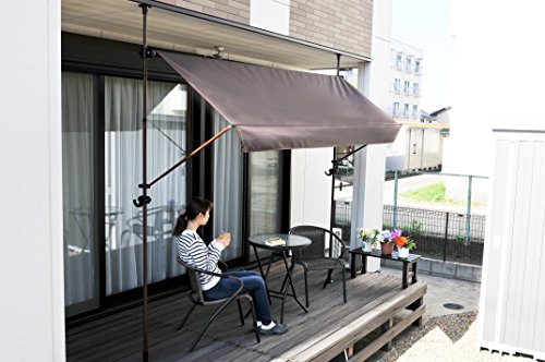 リビングアウトの突っ張り式フック付きオーニングは幅203cm、奥行22〜145cm、高さ200〜300cm。UVカット率99%で物干し竿付き、角度調節可能。テラスやカフェにピッタリのスタイリッシュなデザインです。