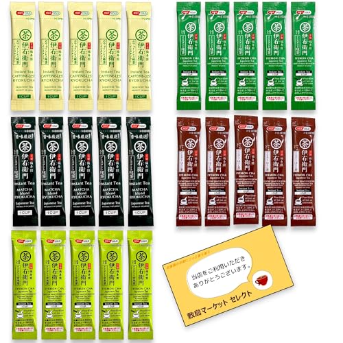 伊右衛門のインスタントスティックは、緑茶、玄米茶、ほうじ茶、カフェインレス、香味厳選緑茶の5種類を各10袋セットで提供。計50袋入りで、さまざまな茶の風味を手軽に楽しめます。