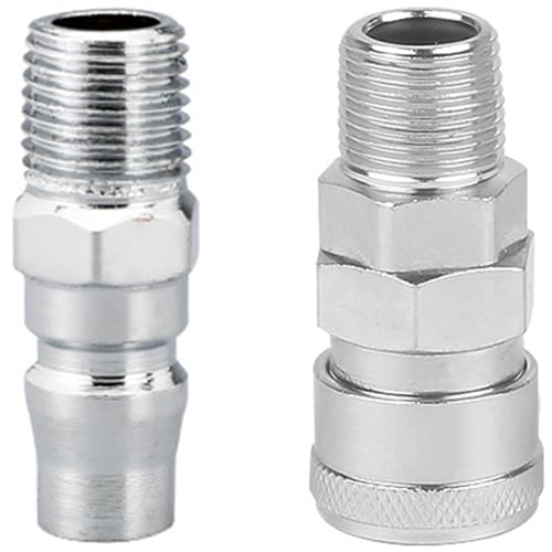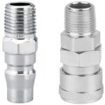 エアーカップリングのオネジ用プラグとソケット、クイックリリースタイプ。RT1/4サイズ、PM 20、SM 20対応。防錆・耐摩耗で、エアーガンやコンプレッションに最適なシルバー仕上げのアクセサリー。