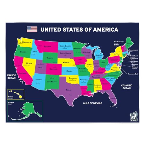プラッキーウォールバナー アメリカの地図ポスター。18インチ x 24インチのサイズで、教師向けに開発された社科教育用壁装飾。アメリカの歴史を楽しく学べるデザイン。