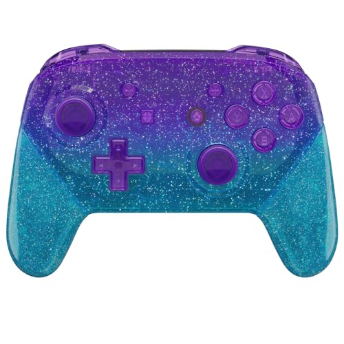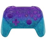 eXtremeRateのSwitch Proコントローラー用フェースプレート&バックプレートハンドル。細かいラメのクリア素材で、DIY交換可能なグリップカバー。碧色とパープルのグラデーションが美しい。