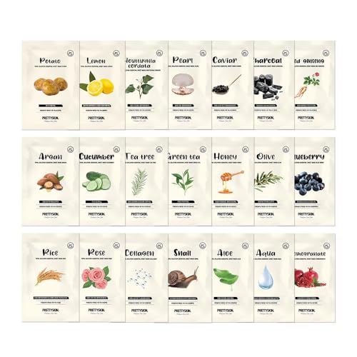 PRETTYSKINトータルソリューションエッセンシャルは、さまざまな韓国スキンケアのフェイスシートマスクを提供。各パックは23gで、21種類の製品があり、肌の保湿や改善に特化した成分が配合されています。