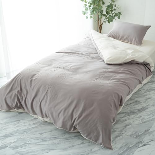 シルフィーズの布団カバー3点セットは、シングルサイズ(150×210cm)で、柔らかなベージュリバーシブルデザイン。北欧スタイルの掛け布団カバー、ボックスシーツ、枕カバーが含まれ、紐付きで新生活に最適です。