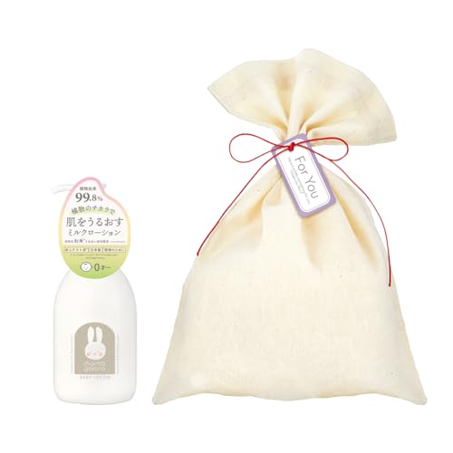 ままごころのミルクタイプ全身ローションは、敏感肌に優しく、植物由来の成分を使用。日本のお米と米ぬかを配合し、新生児から使用可能。ラッピングバッグ入りでギフトに最適。皮ふアレルギーテスト済。