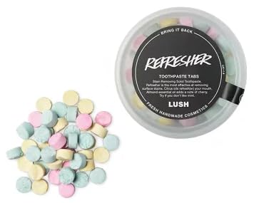 LUSHのリフレッシャーは、フルーティなライム、オレンジ、レモン風味の歯磨き用タブレットです。50gで、セルフホワイトニングや口臭対策に最適。デンタルケアを楽しくするオーラルケア製品です。