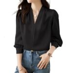 [NISSAI] ブラウス シャツ レディース ビジネス オフィス フォーマル スーツ 就活 OL 事務服 無地 入学式 卒園式 大学 UV 紫外線カット 通勤 長袖 春 夏 30代 Vネック シルク 黒 L, ブラックの高価買取